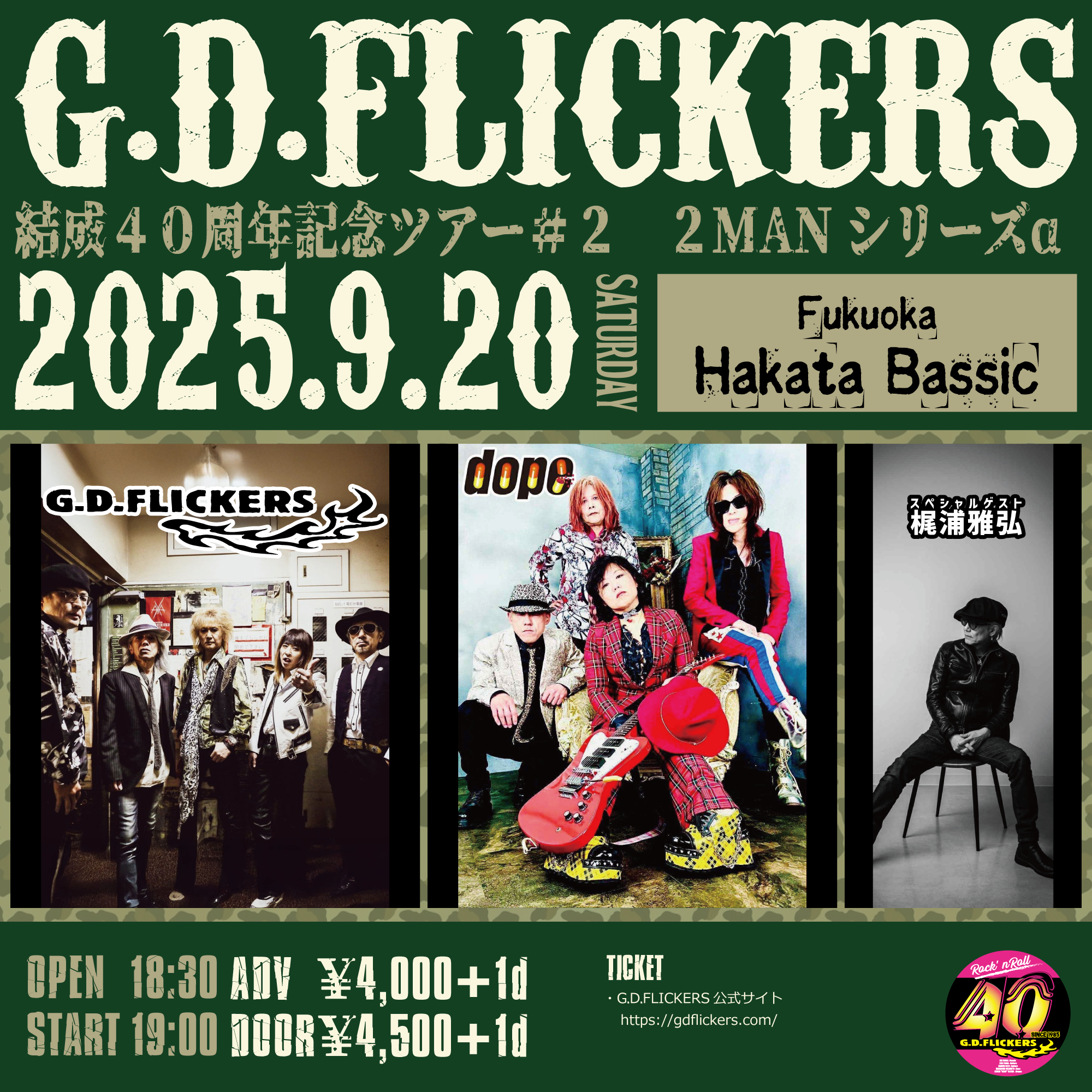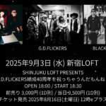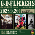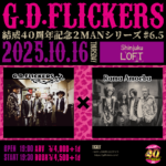 G.D.FLICKERS 35周年、そうあれは35年くらい前に私は原宿で生きてまして毎日のように原宿のギャルをヒーヒー言わしてたんですが、ある時を境にヒーヒー言わす女言わす女がハラちゃんハラちゃんと口々に言うわけです。で、なんなんだそのハラちゃんてのは?と聞いたところ、G.D.FLICKERSのハラちゃんだと言うわけです。つまりヒーヒー言わす女言わす女全部ハラちゃんにヒーヒー言わされた後だった訳です。その時私の頭にG.D.FLICKERSと言うバンドが深く刻まれました。それから雑誌などでその風貌を見てはメラメラと意味不明の闘争心を燃やしたもんです。それから20年くらい経ちイベントかチェリーボムか忘れましたがJOEさんにお会いした時に気さくに優しく話しかけて頂いた時に、なんて良い人なんだと感動して、私の中で伝説のドンファンとなっていた原ちゃんにもお会いしてこれまたなんて良い人なんだと感動して過去の意味不明の闘争心が綺麗に消え去り、ハクエイさん、岡本さん、オイチョデブちゃんと仲良くさせてもらうようになり、なんとまさかG.D.FLICKERSの35周年イベントに私夜桜極蔵ゲンドウミサイルが出るなんて、あの35年前の自分に言ったら「そんな事は地球がひっくり返ってもあるわけがない」と言う事でしょう。G.D.FLICKERS、35周年おめでとうございます。なんて美化して書きましたが、裏の悪魔的な酷い裏事情はとても書けないのでこの辺で、これからも仲良くしてください。G.D.FLICKERSってなんなんだ‼️